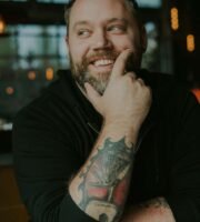 A shopping cart is placed on a tiled floor in front of a modern wall with vertical lines and glowing circular lights resembling exclamation marks. The overall setting is minimalist with a monochrome color scheme.